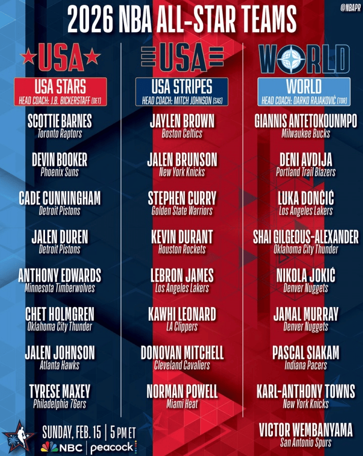 北京时间2月4日,2026年NBA全明星赛阵容分队正式揭晓,美国明星队、美国条纹队与世界队将展开循环赛制的小型锦标赛,进行四场12分钟的比赛。